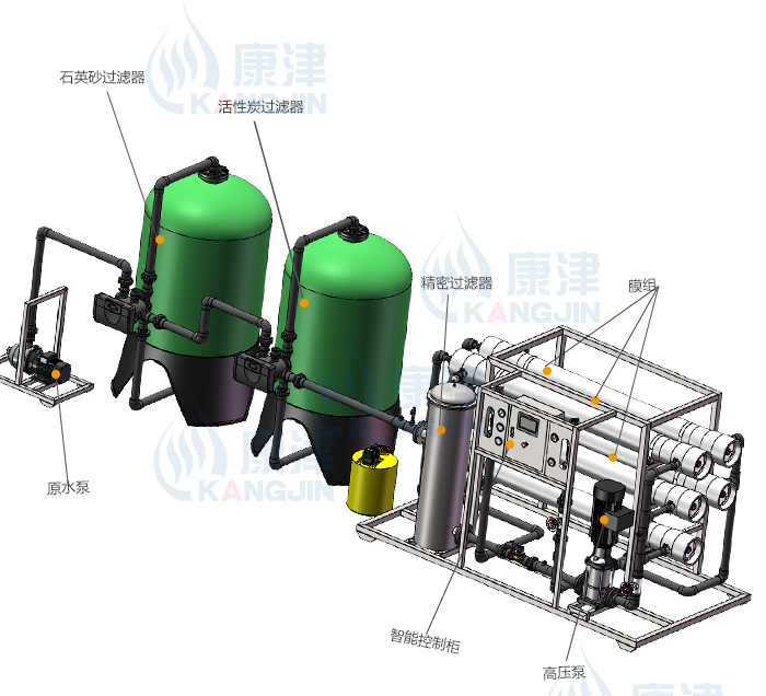 為保證關(guān)鍵設(shè)備,如:單反滲透裝置的長期可靠穩(wěn)定運行,設(shè)置預(yù)處理系統(tǒng),滿足反滲透膜(RO)進水指標(biāo):濁度<0.5NTU、SDI<4、余氯<0.1ppm。根據(jù)原水水質(zhì),預(yù)處理系統(tǒng)由原水水箱、原水泵、多介質(zhì)過濾器、活性炭過濾器、軟化過濾器、保安過濾及相關(guān)輔助設(shè)備組成。